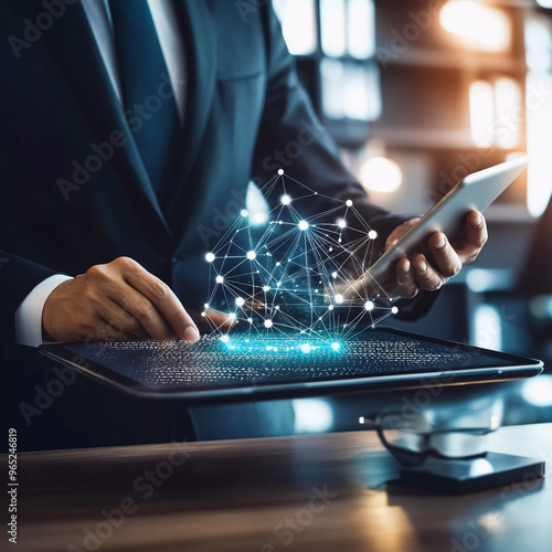 Generative AI A lawyer reviewing a digital smart contract on a tablet in a modern office, symbolizing the transformation of legal processes through blockchain technology, natural light