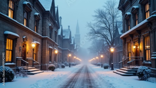 Generative AI, a snowy street with a church in the background and a light pole in the foreground with a clock tower in the distance, winter, a matte painting, heidelberg school