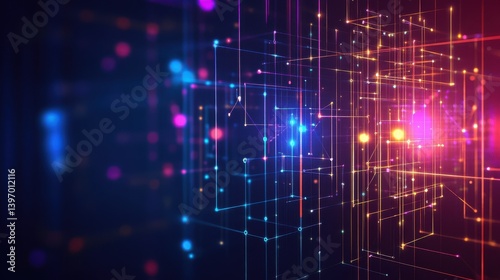 Generative AI abstract illustration of geometric shapes and structures in colorful neon colors and lights in cyberspace against dark background illustration