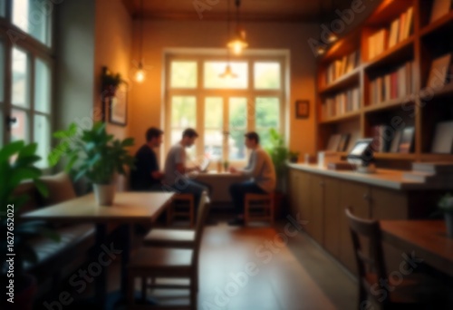 Generative AI Cafe Ambience, Individuals Engaged in Laptop Work, Relaxed Setting, Bookstore, Warm
