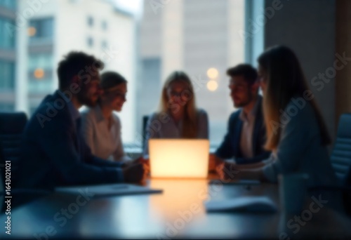 Generative AI depicts a collaborative business meeting around a glowing laptop in an office setting