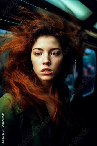 Generative AI illustration Beautiful young girl with long hair in the New York subway