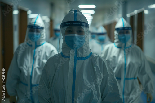 Generative AI illustration of people in biohazard protective clothes suits disinfection pollution gas radioactive elements