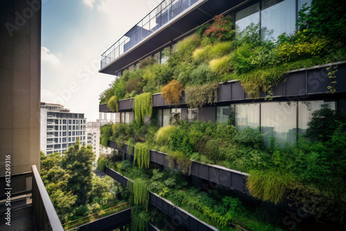 Generative AI illustration of Sustainable building with vertical garden made with recycled material