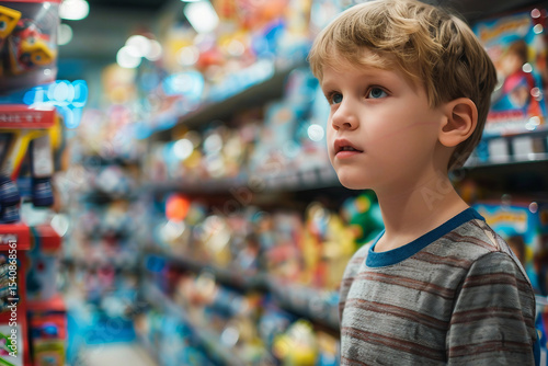 Generative AI image of a cheerful child enjoying a visit to a colorful toy store