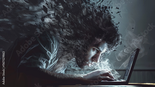 Generative AI, Man Dissolving into Digital Fragments at a Laptop