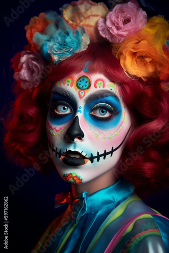 Generative Ai of a woman representing Calavera Catrina with red flowers and skull painting. Day of the Dead concept.