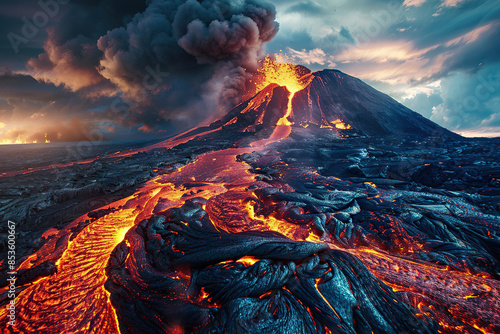 Generative ai on theme of erupting volcano with cascading hot lava surrounded thick white smoke