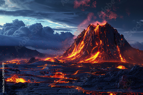 Generative ai on theme of erupting volcano with cascading hot lava surrounded thick white smoke