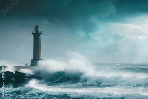 Generative ai on theme of large retro lighthouse with beam of bright light shining out to blue sea