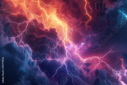 Generative ai on theme of scary bright electric lightning bolt with branches in the night dark sky