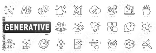 Generative AI outline icon set showcasing creativity, design, idea lightbulb, neural network, automation, cloud, chat, mobile, vector, editable stroke, workflow