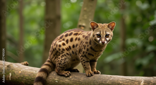 Genet cat perched on fallen log in forest with spotted fur and long tail. Wild feline with distinctive markings and alert gaze. Nocturnal animal behavior educational materials