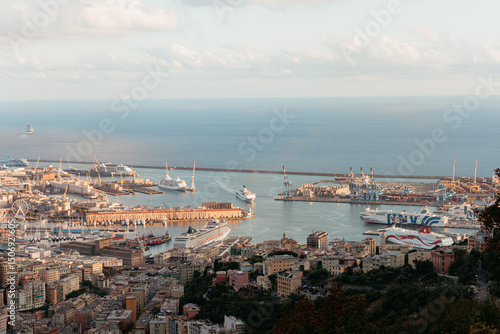 Genova harbor with docked cruise ships and ferris wheel on a sunny day