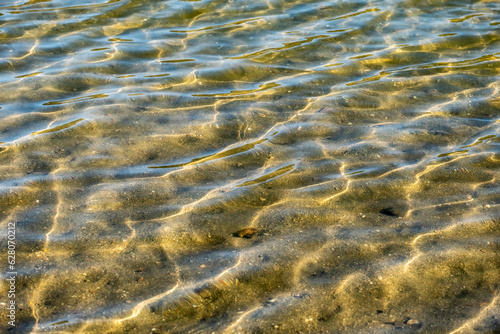 Gentle and relaxing waves of clear water on the shore of a lake.