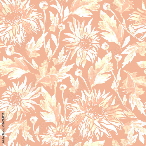 Gentle watercolor seamless pattern with light halftones of flowers silhouettes and leaves. For floral design, apparel textile, wallpaper, bedding, fabric, poster, package.