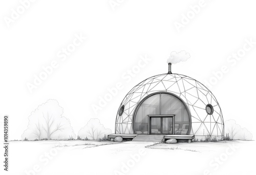 Geodesic dome black and white sketch exterior front elevation. geodesic structure with a big panoramic window and a little chimney
