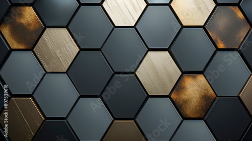 Geometric abstract background with hexagons in black, silver and gold colors. Flat lay.