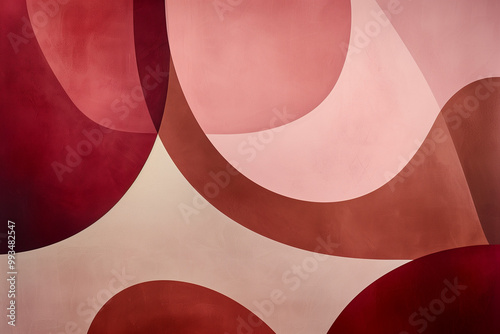 Geometric abstract circles in shades of red, pink, and beige. The overlapping shapes and smooth transitions between colors create a modern, layered design with a vibrant, energetic feel.