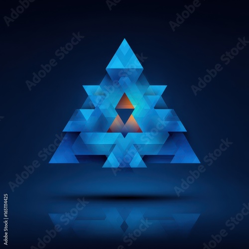 Geometric abstract design featuring layered blue shapes with a central orange triangle on dark background