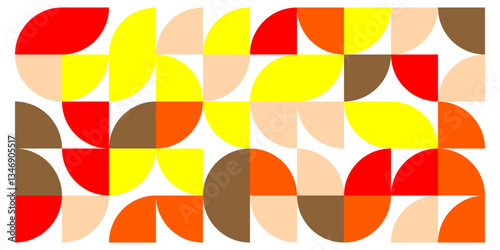geometric abstract pattern with semicircles and quarter circles in red, yellow, orange, brown, and beige. The design creates a modern, retro-style mosaic with a dynamic and artistic look.