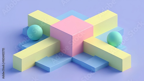 Geometric arrangement featuring pastel cubes, spheres, and blocks on a blue surface
