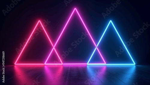 Geometric arrangement of neon triangles and diamonds glowing in a dark space with overlay space