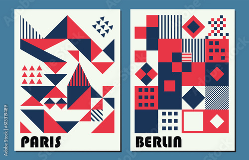 Geometric bauhaus vector pattern wall art.Set of 2.Red white and blue abstract squares and triangle minimalist retro decoration on a off white background.Perfect for decor,brochure,poster,card,covers