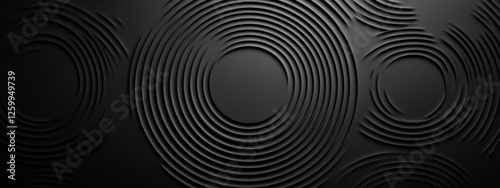 Geometric black circles and lines on a dark background. Geometric pattern for banner template with white space in the center for text. Minimalist wallpaper with copy space.