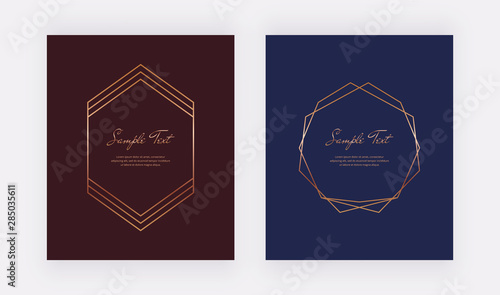 Geometric cover design with red and blue background and golden polygonal lines frames. Trendy templates for banner, flyer, poster, greeting.