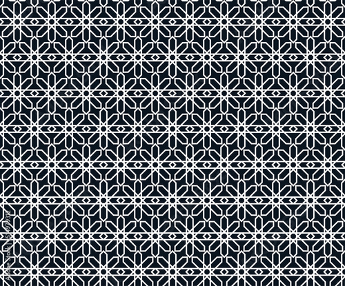 Geometric ethnic Islamic pattern. Design with white lines on a blue-black background.