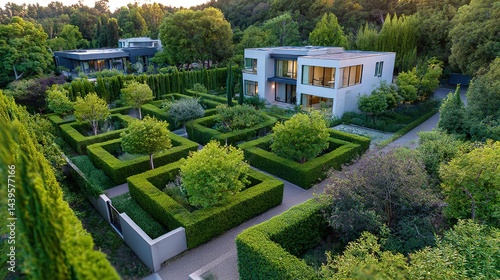 Geometric hedges frame a modern home, aerial view in morning light, showcasing architectural harmony with nature.