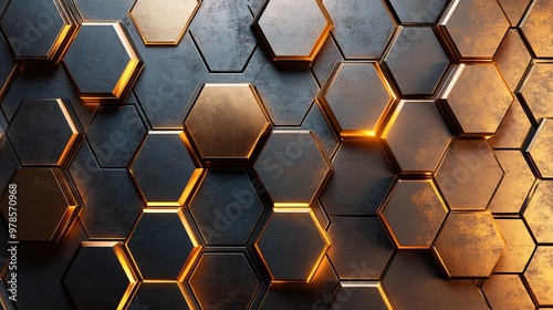 Geometric hexagonal pattern in warm gold and bronze tones, digital design with metallic textures, soft shadows and glowing highlights, high-resolution details, elegant and modern aesthetic