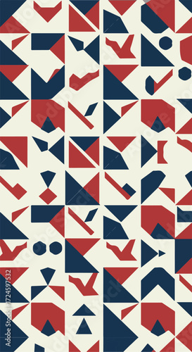 Geometric pattern with red and blue shapes on a white background.