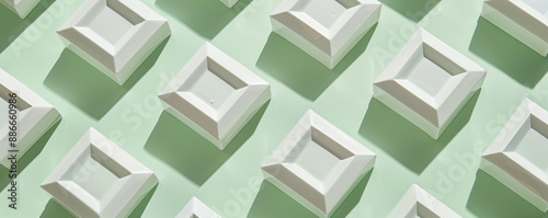 Geometric pattern with white 3D shapes on a pastel green background.