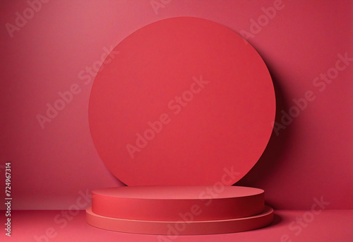 Geometric podium on abstract red background for product display. Top view mockup in magenta, color of 2023.