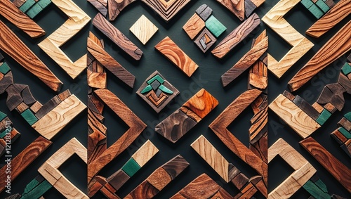 Geometric wooden design display pattern on dark background displaying natural wood textures