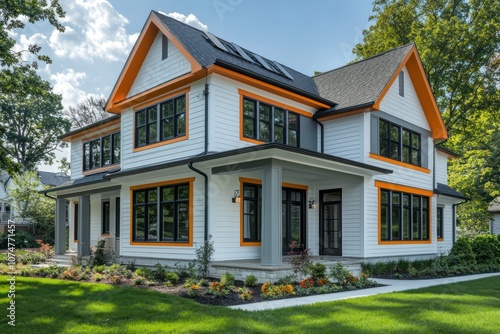 Georgian family home showcasing a peaceful white exterior with orange and gray trim.