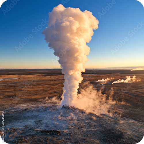 Geothermal vent emitting steam in a desolate landscape under a clear sky.