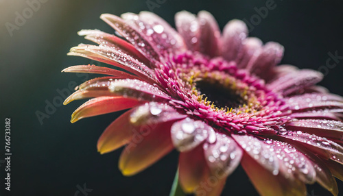 gerber daisy macro with droplets on dark background, symbolizing freshness and vitality. Copy space available