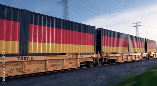 German export. Running train loaded with containers with the flag of germany.