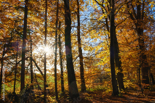 Germany, Bavaria, autumnal beech forest in sunshine near Dietramszell