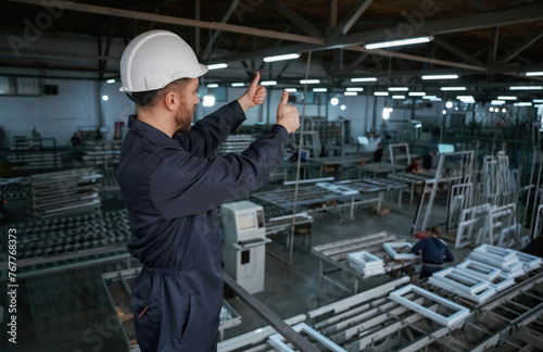 Gesture of thumb up. Factory worker is indoors with hard hat