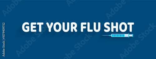Get your flu shot banner vector illustration. Vaccination slogan with syringe icon isolated. Vaccine concept design. medicine background. medical health care image. Dark backdrop, white color text