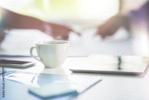 Getting through the workday. Shot of a teacup on a table with two businessmen working in the background.
