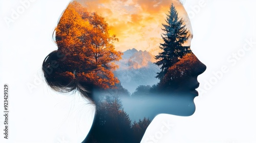 Ghostly figure overlapping with a serene autumn landscape, creating a haunting yet peaceful atmosphere, Halloween double exposure, ethereal contrast