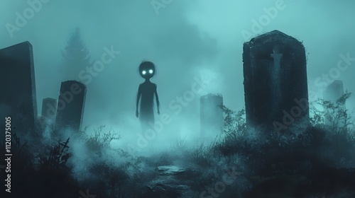Ghostly figure with glowing white eyes standing in a misty graveyard surrounded by tombstone and eerie fog under a dark and mysterious atmosphere