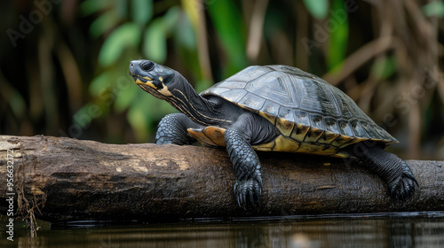 Giant river turtle basking on a log in the Amazon, its shell blending with the natural surroundings