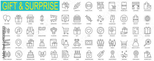 Gift and surprise web icons set in thin line design. Pack of confetti, music, toy, e-commerce, laurel wreath, discount, wishlist, price tag, cake, other outline Editable stroke pictograms.