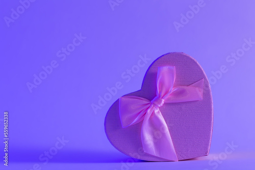 Gift box in the shape of a heart in neon lighting, the concept of Valentine's day, romance and love, copy space.